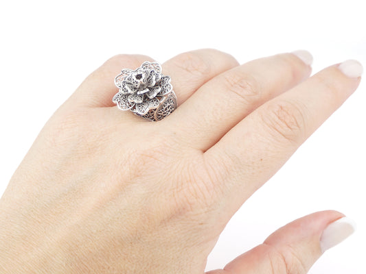 Anel Flor Rica, ajustável, Filigrana Portuguesa, Prata de Lei 925
