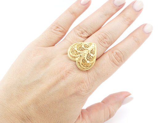 Anel Coração de Viana Grande, ajustável, Filigrana Portuguesa, Prata de Lei 925 Dourada