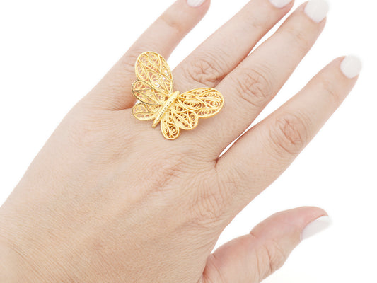 Anel Borboleta Ajustável, Filigrana Portuguesa, Prata de Lei 925 Dourada