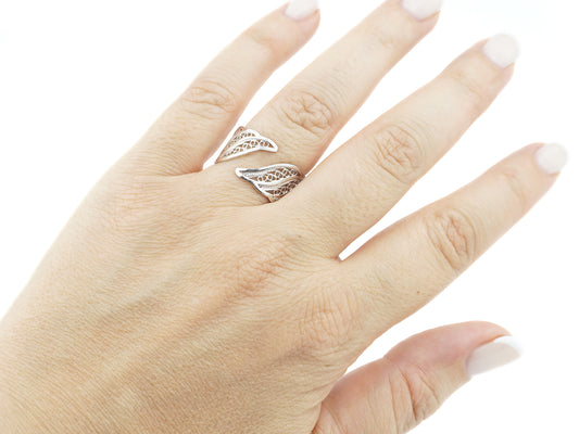 Anel Ajustável Folhinhas e Circulos, Filigrana Portuguesa, Prata de Lei 925