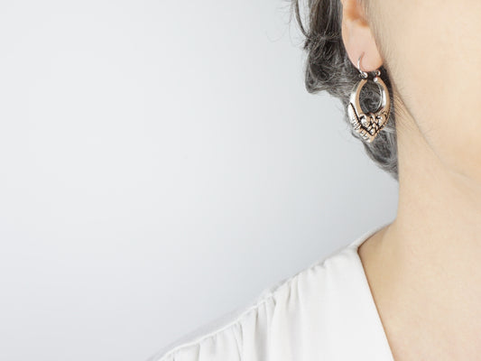 Os Brincos Barrocos, com seu aspeto bojudo e impactante, surpreendem pela leveza, desafiando a percepção visual. São peças ocas, de face única ou dupla, onde cada detalhe é esculpido em chapa de prata fina com pancadas precisas, utilizando instrumentos ancestrais como os cunhos de bronze datados dos séculos XVIII e XIX.