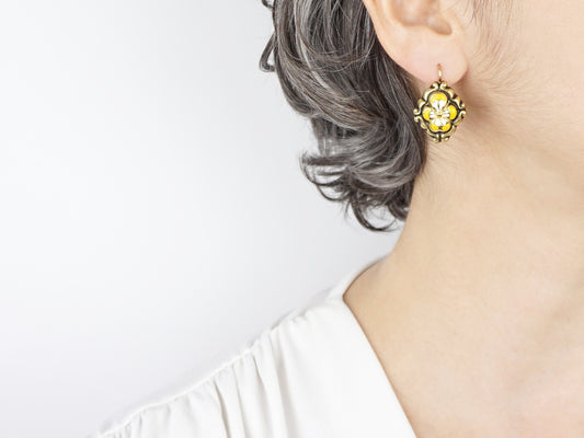 Brincos Barrocos Flor Amarela e Branca, Prata de Lei 925 Dourada