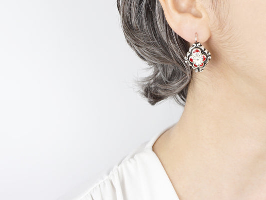Brincos Barrocos Flor Vermelha e Branca, Prata de Lei 925