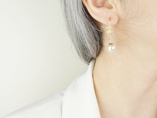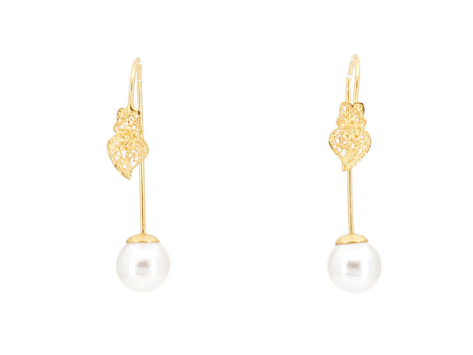 Brincos Flor com Pérola, Filigrana Portuguesa, Prata de Lei 925 Dourada