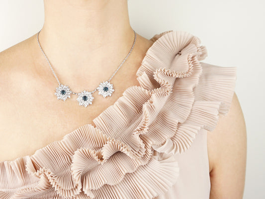 Conjunto Brincos e Colar Flor Rica com Pedras, Filigrana Portuguesa, Prata de Lei 925