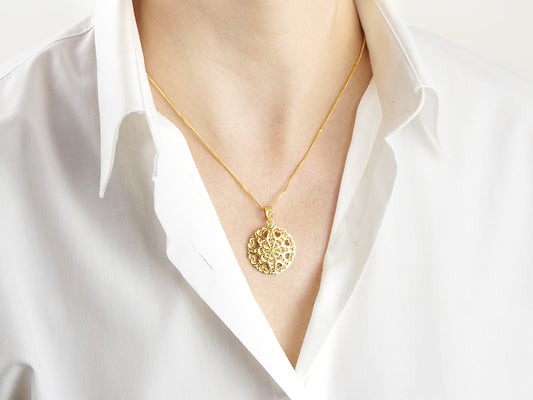 Colar Medalha Redonda com Corações, Filigrana Portuguesa, Prata de Lei 925 Dourada