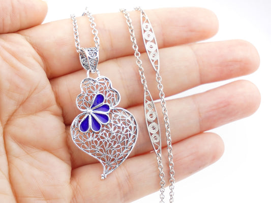 Colar Trancelim com Coração Médio Pétalas Esmalte, Filigrana Portuguesa, Prata de Lei 925