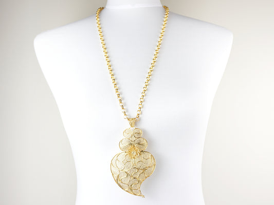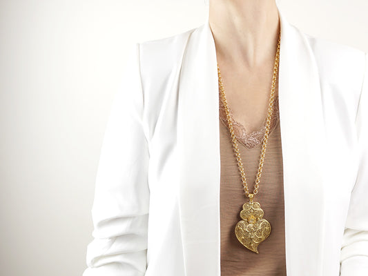 Colar Trancelim Extra Comprido com Coração de Viana Grande, Filigrana Portuguesa, Prata de Lei 925 Dourada
