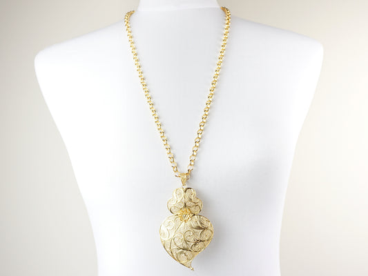 Cordão com Coração de Viana Extra Grande, Filigrana Portuguesa, Prata de Lei 925 Dourada