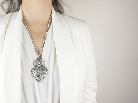 Colar Trancelim Extra Comprido com Coração de Viana Grande, Filigrana Portuguesa, Prata de Lei 925