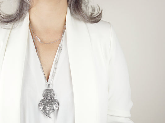 Destacamos o Coração de Viana e as Contas de Viana em muitos dos nossos Colares, incorporando o icónico coração que simboliza amor e tradição.