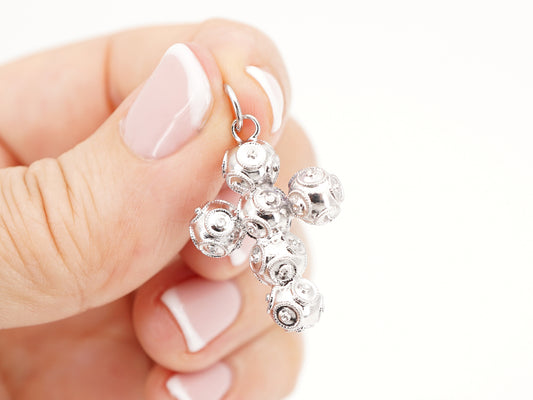 Medalha Cruz Pequena de Contas de Viana 6mm, Filigrana Portuguesa, Prata de Lei 925