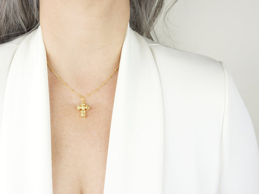 Colar com Cruz Média de Contas de Viana, Filigrana Portuguesa 8mm, Prata de Lei 925 Dourada