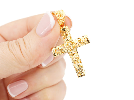 Colar com Cruz, Filigrana Portuguesa, Prata de Lei 925 Dourada