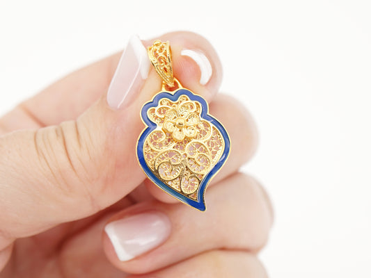 Medalha Coração de Viana com Rebordo Azul, Filigrana Portuguesa, Prata de Lei 925 Dourada