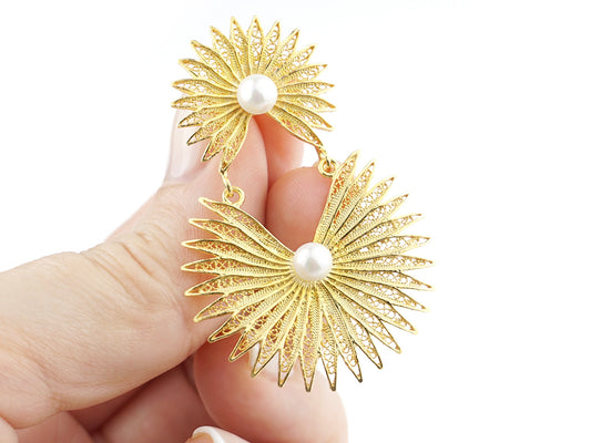 Medalha Comprida com Pérolas, Filigrana Portuguesa, Prata de Lei 925 Dourada