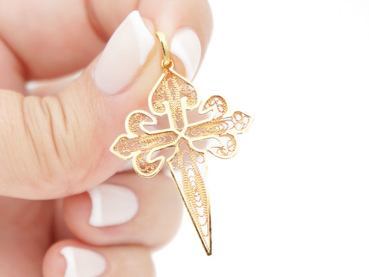 Medalha Cruz de Arestas Acentuadas, Filigrana Portuguesa, Prata de Lei 925 Dourada