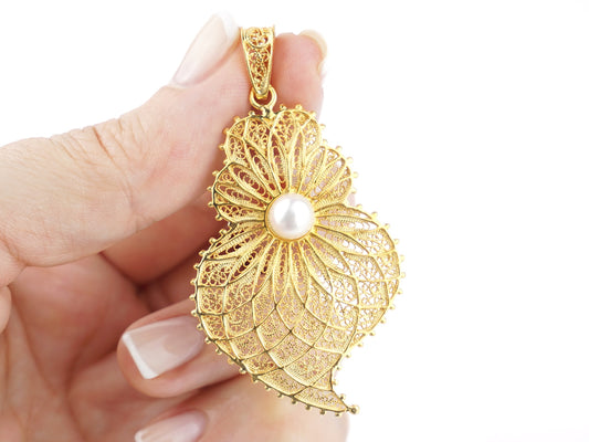 Medalha Coração com Pérola, Filigrana Portuguesa, Prata de Lei 925 Dourada