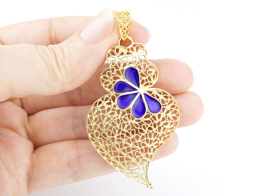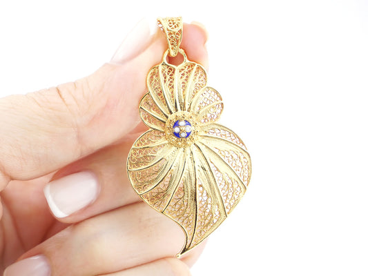 Medalha Coração Grande com Pétalas Esmaltadas, Filigrana Portuguesa, Prata de Lei 925 Dourada