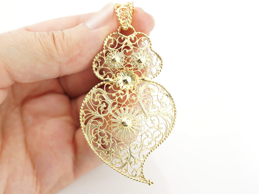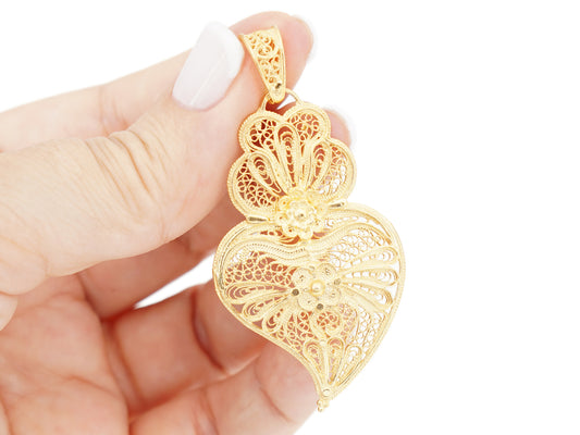 Medalha Coração Renda Grande, Filigrana Portuguesa, Prata de Lei 925 Dourada