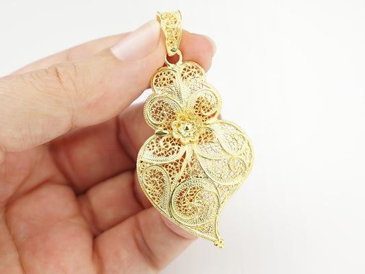 Medalha Coração Pétalas Grande, Filigrana Portuguesa, Prata Dourada 925