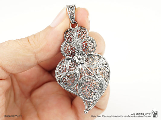 Medalha Coração Pétalas Grande, Filigrana Portuguesa, Prata de Lei 925