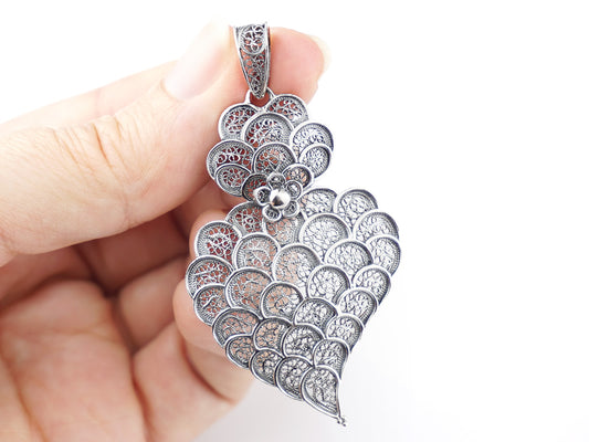Medalha Coração Escamas Grande, Filigrana Portuguesa, Prata de Lei 925