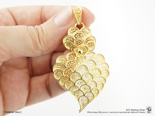 Medalha Coração Escamas Grande, Filigrana Portuguesa, Prata de Lei 925 Dourada