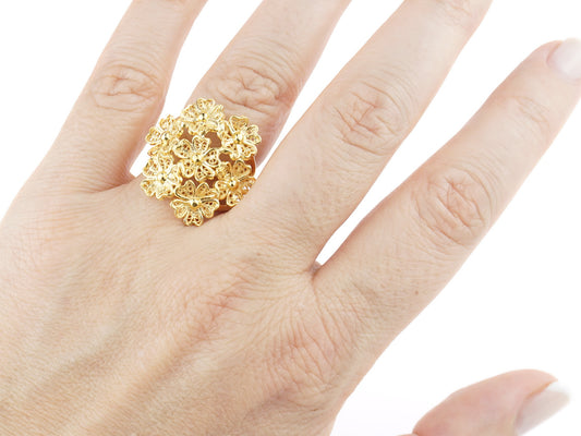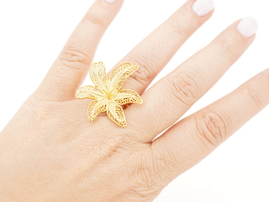 Anel Flor Grande Ajustável, Filigrana Portuguesa, Prata de Lei 925 Dourada