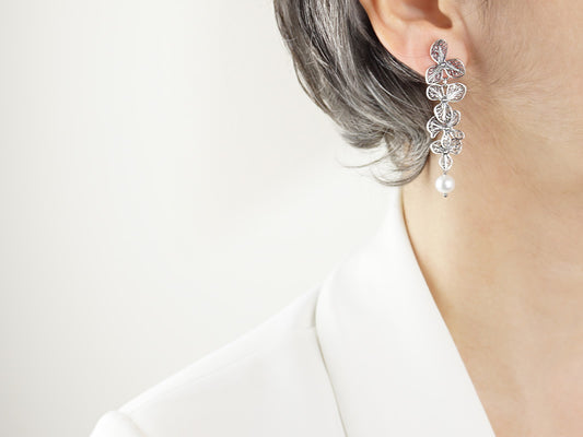Brincos Compridos Flores com Pérolas, Filigrana Portuguesa, Prata de Lei 925