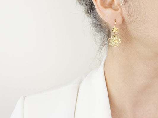 Brincos Flores Elaboradas Médias, Filigrana Portuguesa, Prata de Lei 925 Dourada