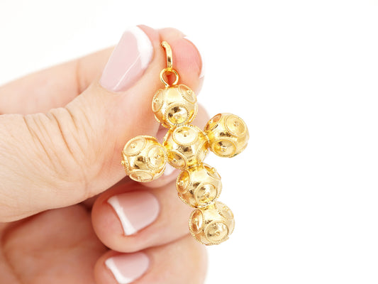 Medalha Cruz Pequena de Contas de Viana 6mm, Filigrana Portuguesa, Prata de Lei 925 Dourada