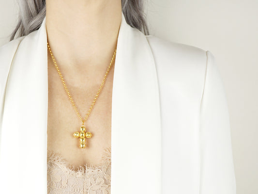 Colar com Cruz Média de Contas de Viana, Filigrana Portuguesa 8mm, Prata de Lei 925 Dourada