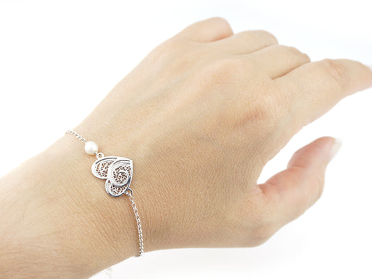 Pulseira Coração e Pérola, Filigrana Portuguesa, Prata de Lei 925