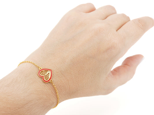 Pulseira Coração Médio Esmalte Vermelho, Filigrana Portuguesa, Prata de Lei 925 Dourada