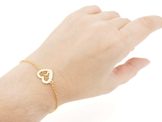 Pulseira Coração Médio Esmalte Branco, Filigrana Portuguesa, Prata de Lei 925 Dourada