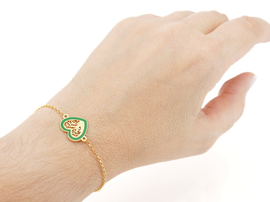Pulseira Coração Médio Esmalte Verde, Filigrana Portuguesa, Prata de Lei 925 Dourada