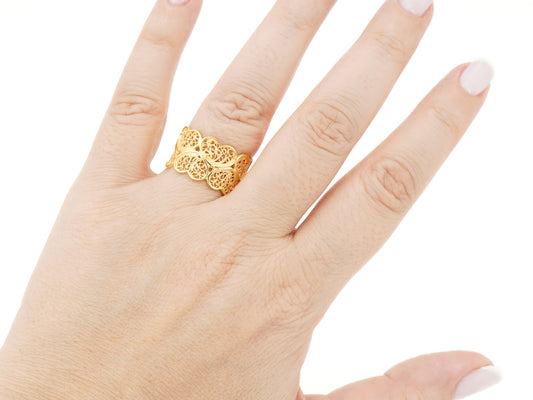 Hearts Tall Adjustable Ring, Portuguese Filigree, Golden 925 Sterling Silver