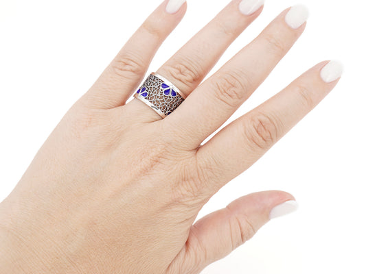 Adjustable Ring with Enameled Petals, Portuguese Filigree, 925 Sterling Silver
