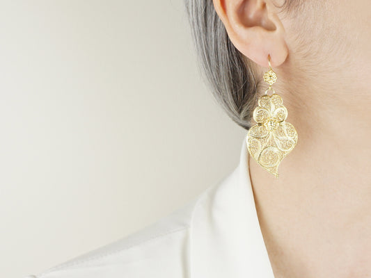 Extra Large Leaf Earrings, Portuguese Filigree, Golden 925 Sterling Silver