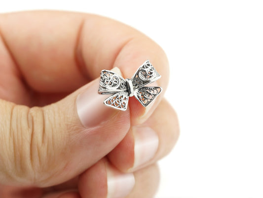 Bow SET, Small Earrings + Adjustable Ring, Portuguese Filigree, 925 Sterling Silver