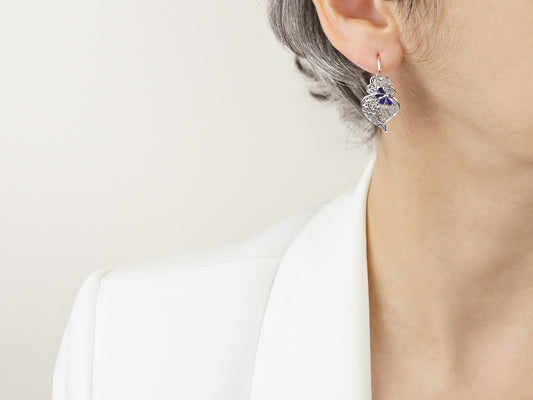 Set of Earrings and Necklace Classic Flowers with Blue Enamel, Portuguese Filigree, 925 Sterling Silver