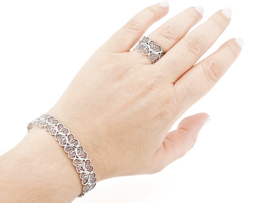 Small Tiled Hearts SET Ring and Bracelet, Portuguese Filigree, 925 Sterling Silver
