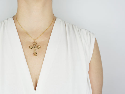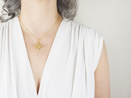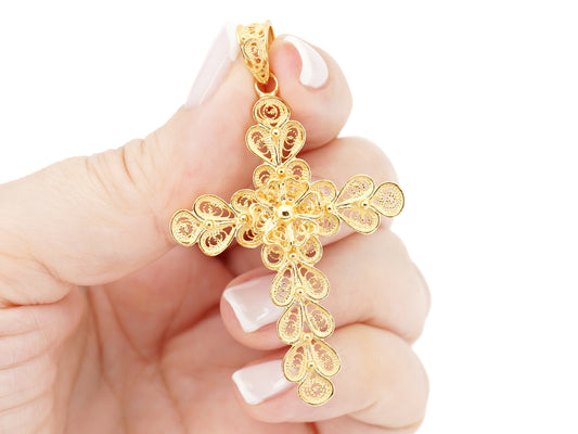 Leafy Cross Pendant, Portuguese Filigree, Golden 925 Sterling Silver