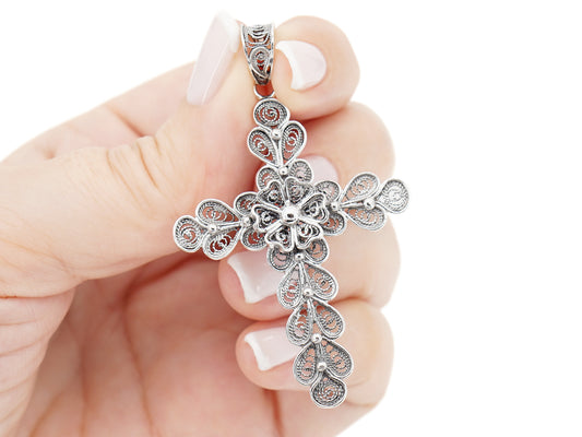 Leafy Cross Pendant, Portuguese Filigree, 925 Sterling Silver