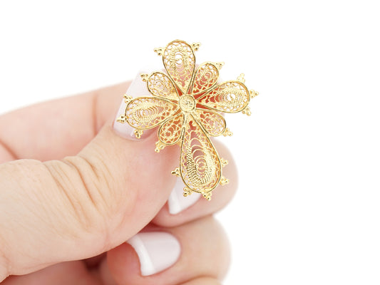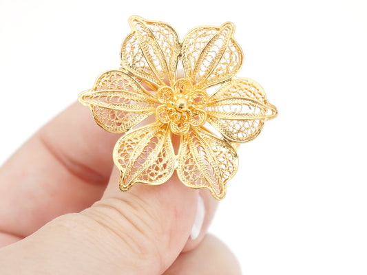Flower Pin / Brooch, Portuguese Filigree, Golden 925 Sterling Silver