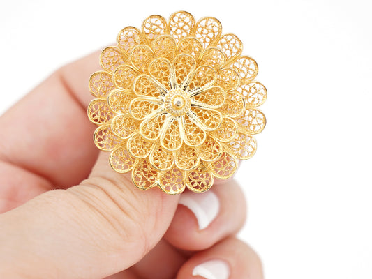 Intricated Flower Pin / Brooch, Portuguese Filigree, Golden 925 Sterling Silver