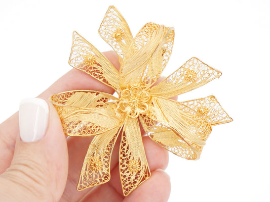Flower & Ribbons Pin / Brooch, Portuguese Filigree, Golden 925 Sterling Silver