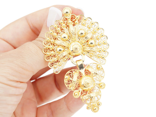 Extra Large Inverted Laça / Galician Pendant and Brooch, Portuguese Filigree, Golden 925 Sterling Silver
