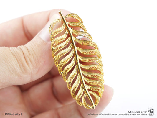 Long Leaf Pendant / Brooch, Portuguese Filigree, Golden 925 Sterling Silver